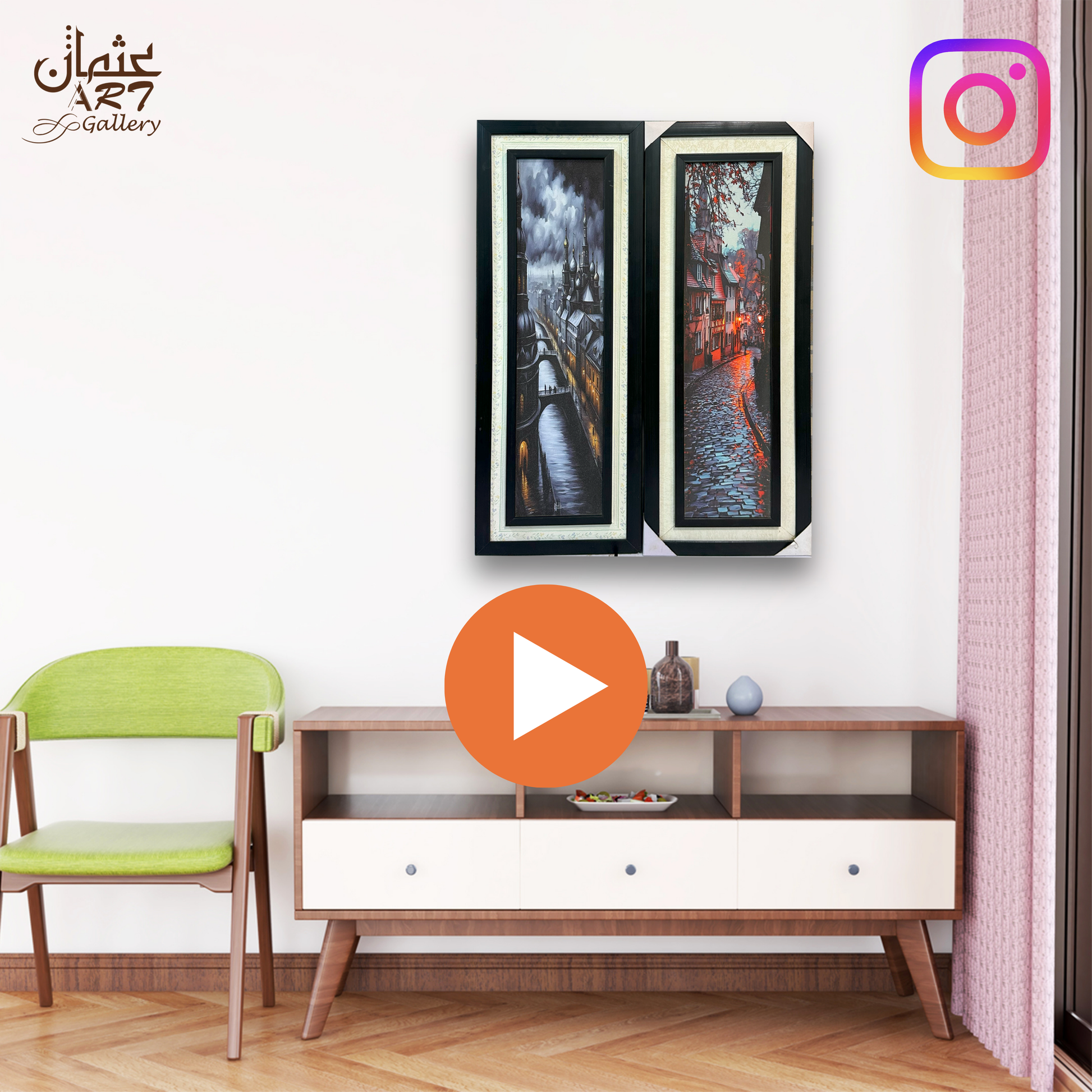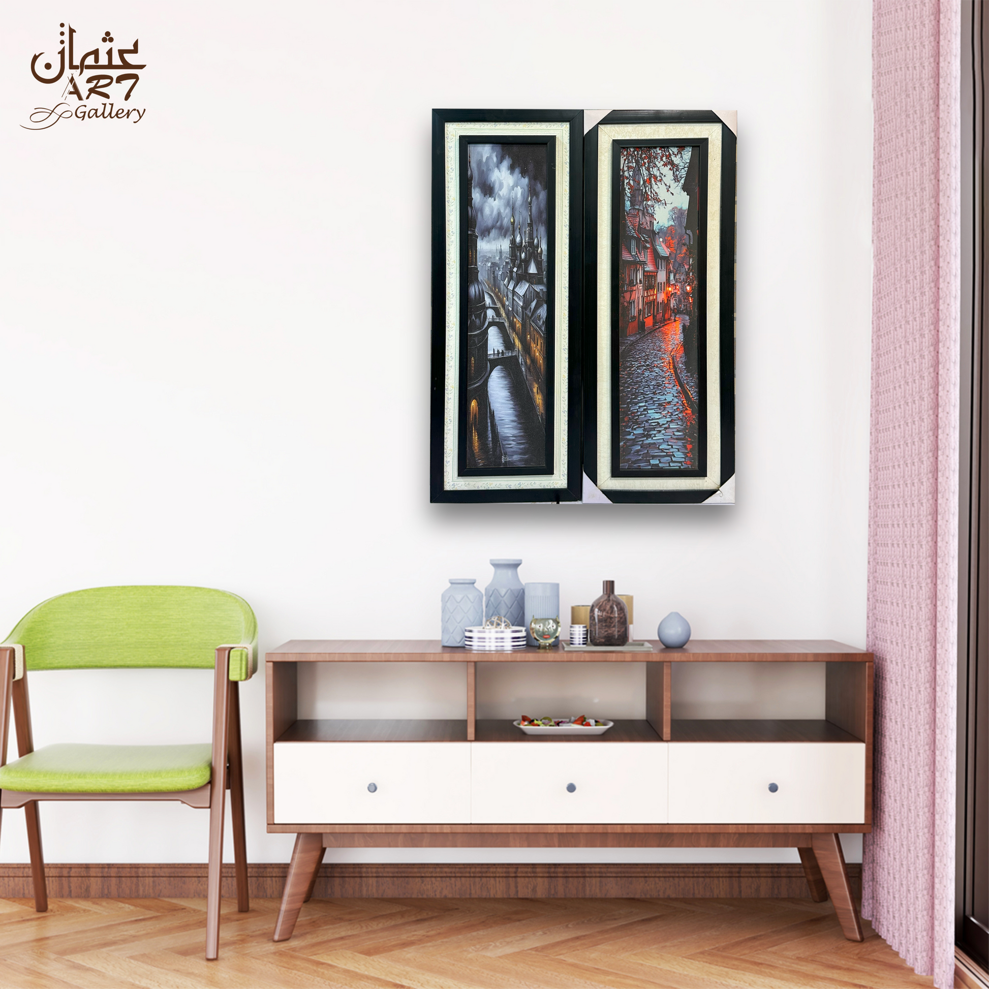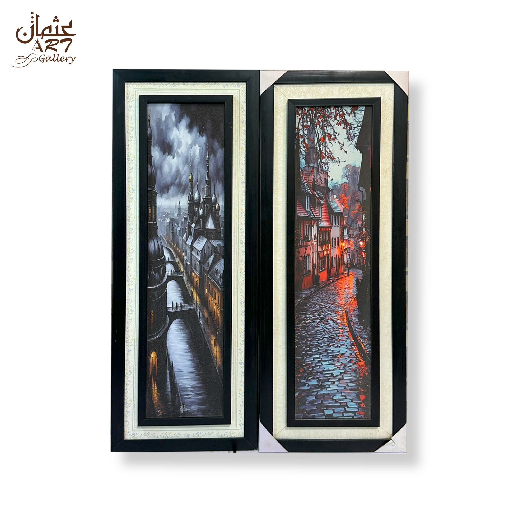 A coordinated two-piece set capturing old-world European streets, one with domed rooftops over a river, the other with a glowing cobblestone lane. Moody skies, wet reflections, and fine architectural lines create a cinematic, 3D-like presence. Double framing completes the premium look and simplifies hanging as a pair. Ideal for dining rooms, entryways, or classic living spaces.