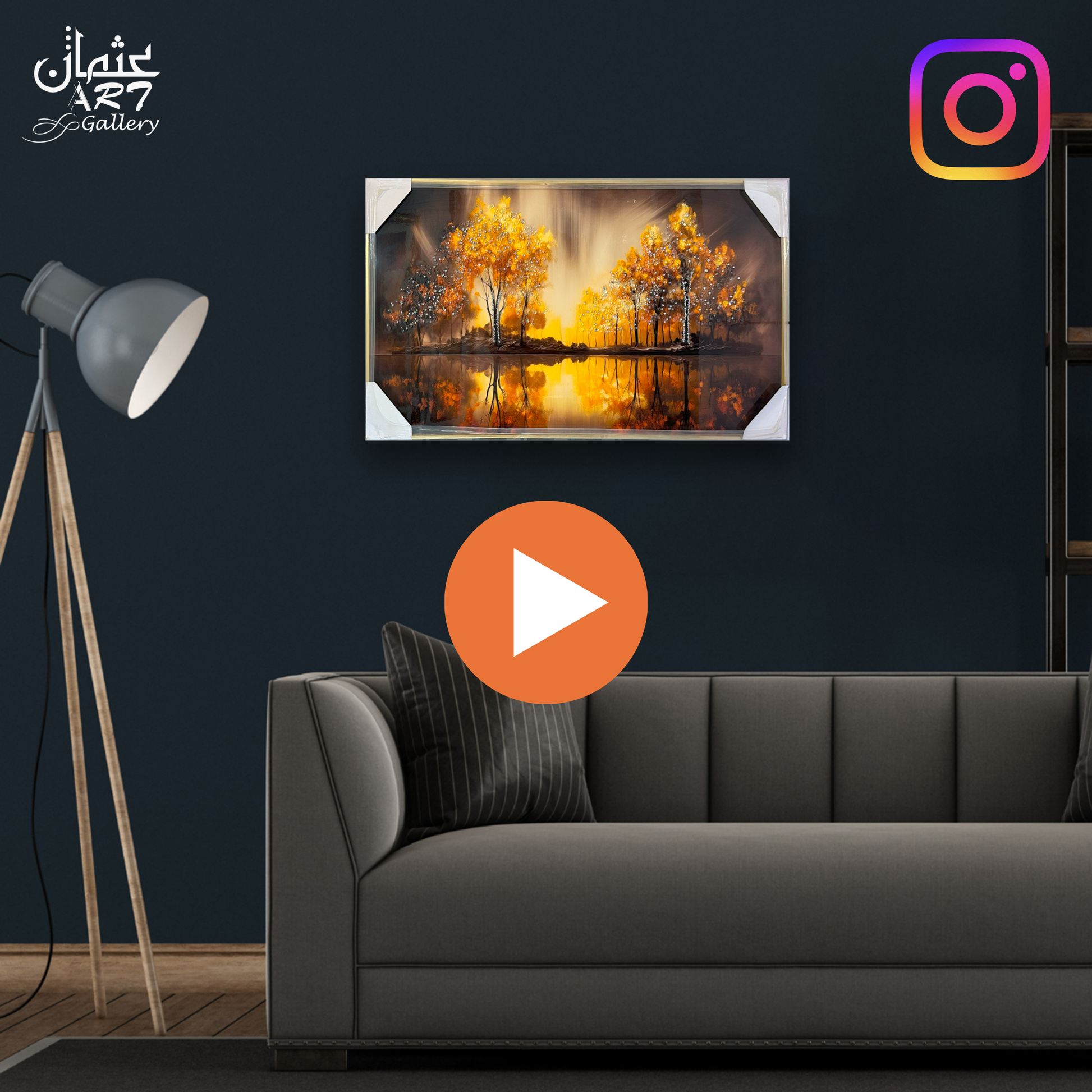 Warm amber grove mirrored in still water with crystal accents on foliage. Panoramic format brings depth and glow, ideal for feature walls or hallways.