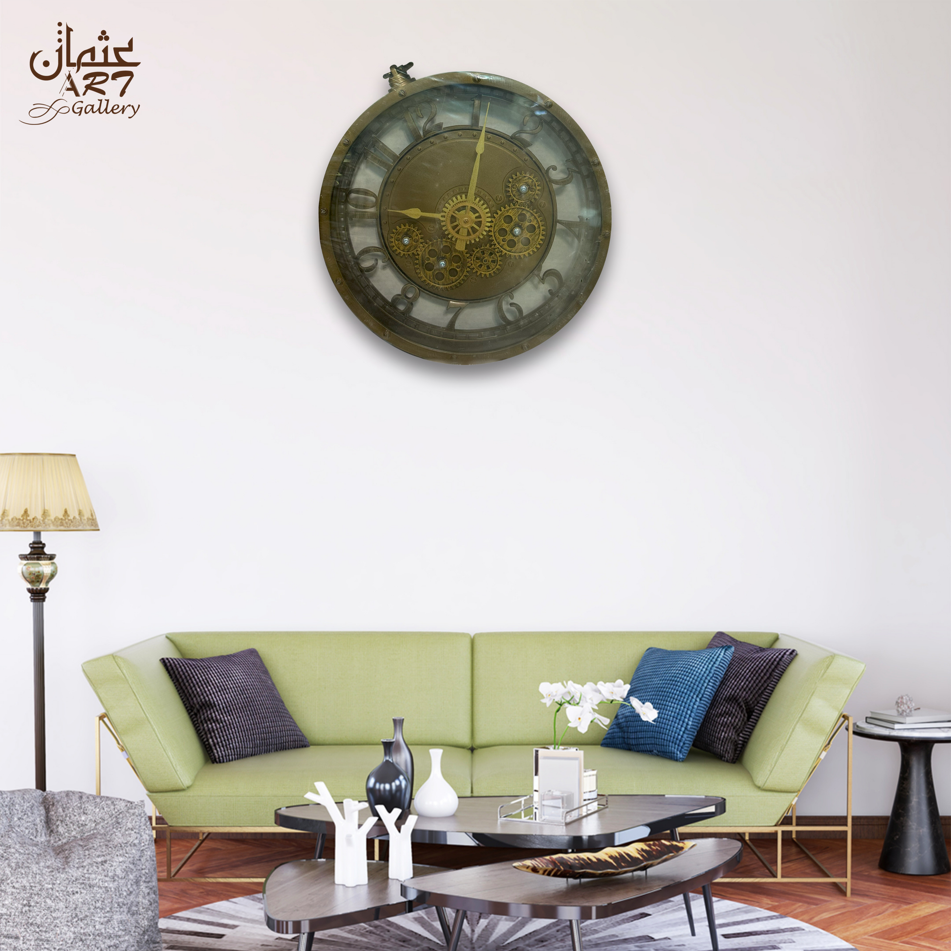 Antique-style brown bordered gear clock with full gear movement powered by quartz mechanism. Compact and decorative for vintage interiors.