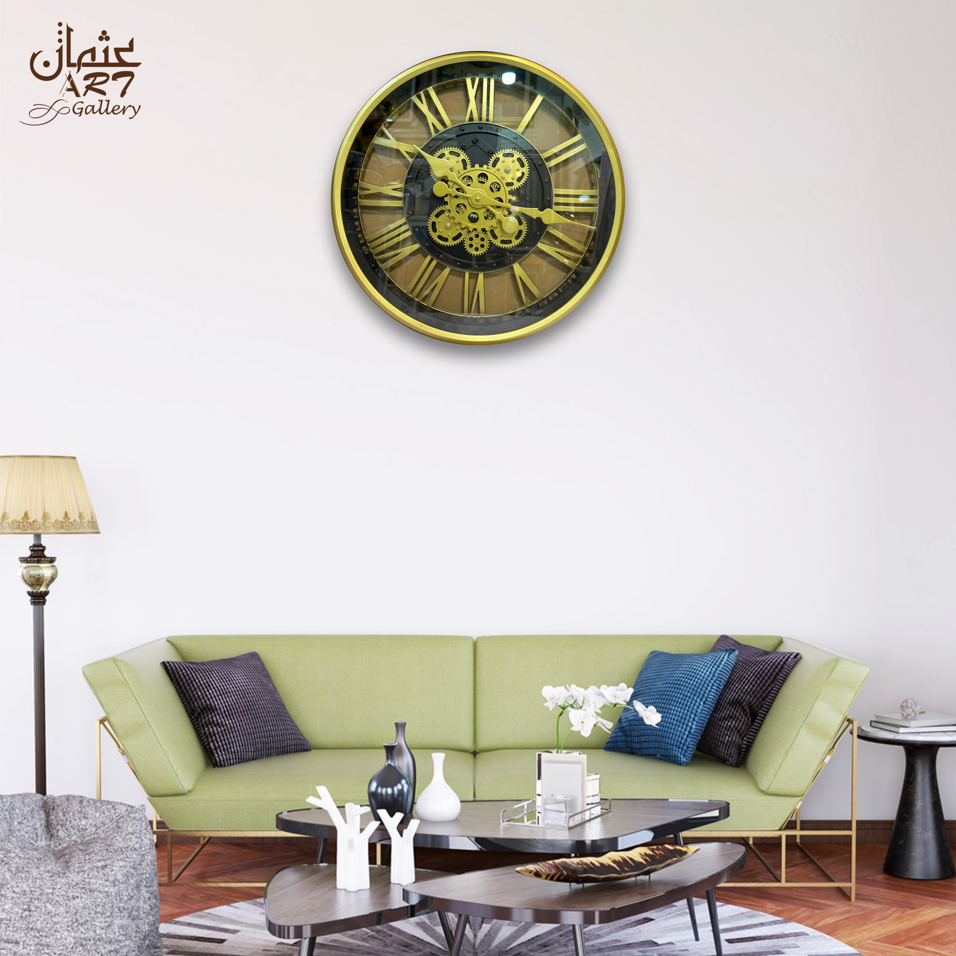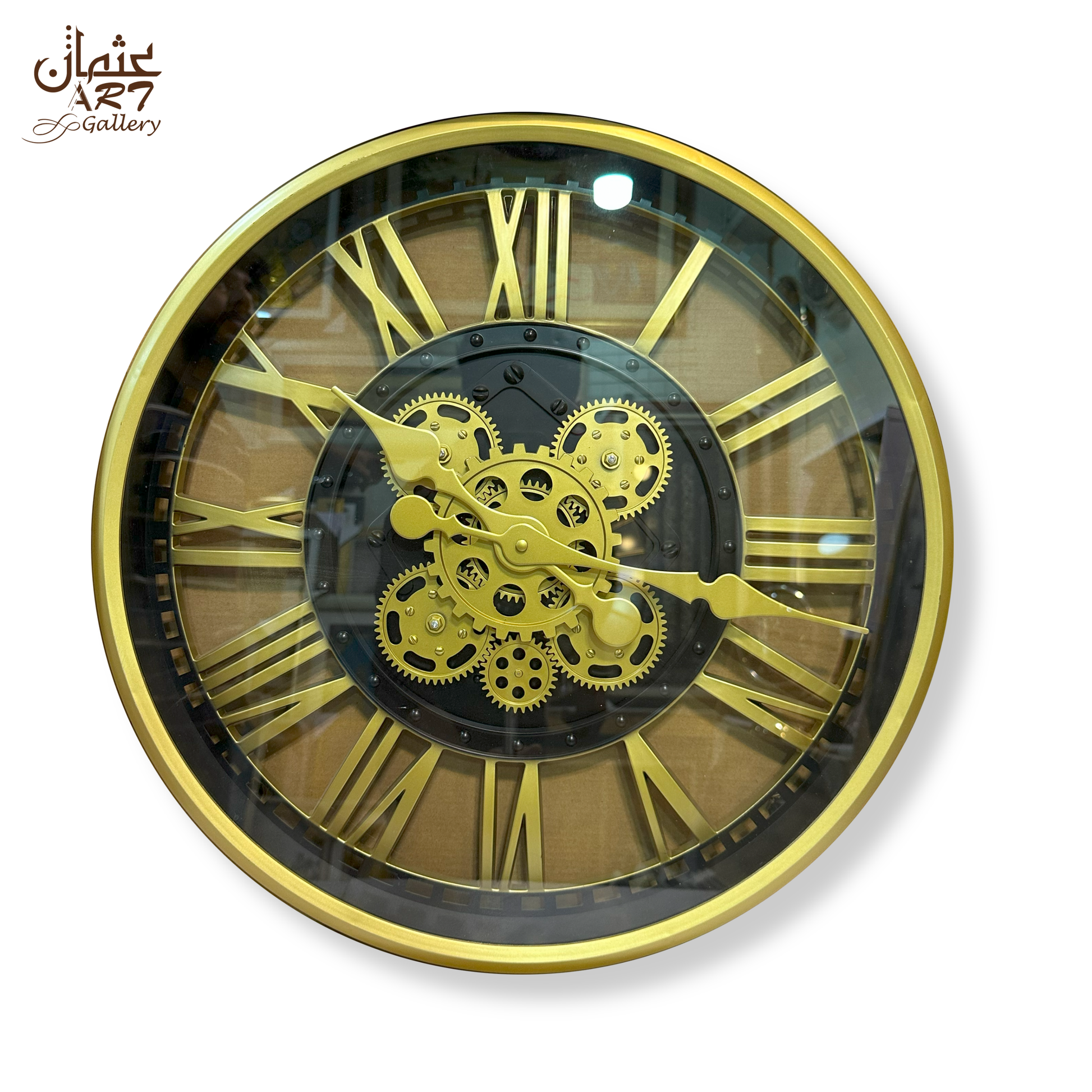 Antique-style gear clock with large Roman numerals and fully visible running gears. The transparent background and detailed mechanics create a striking focal point.