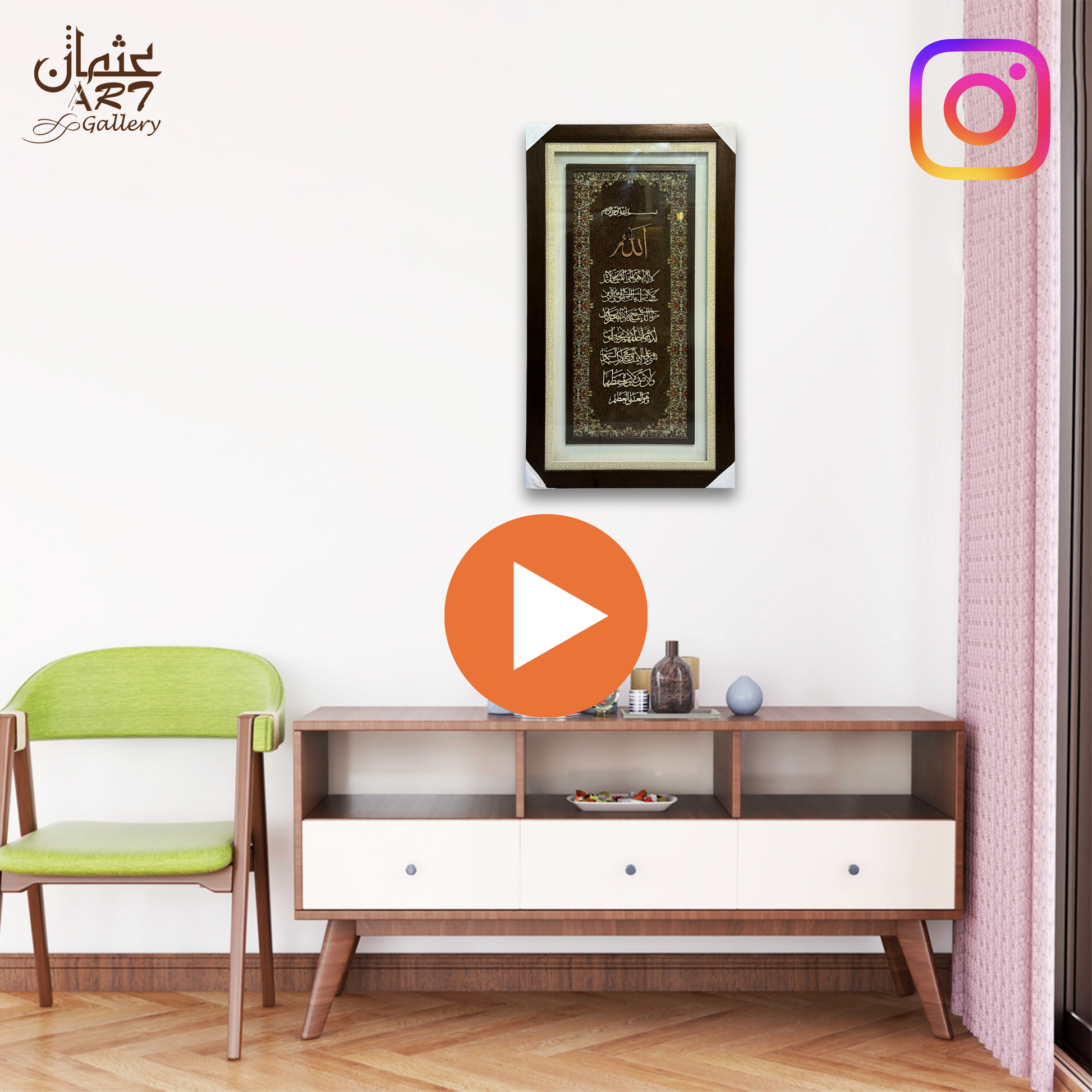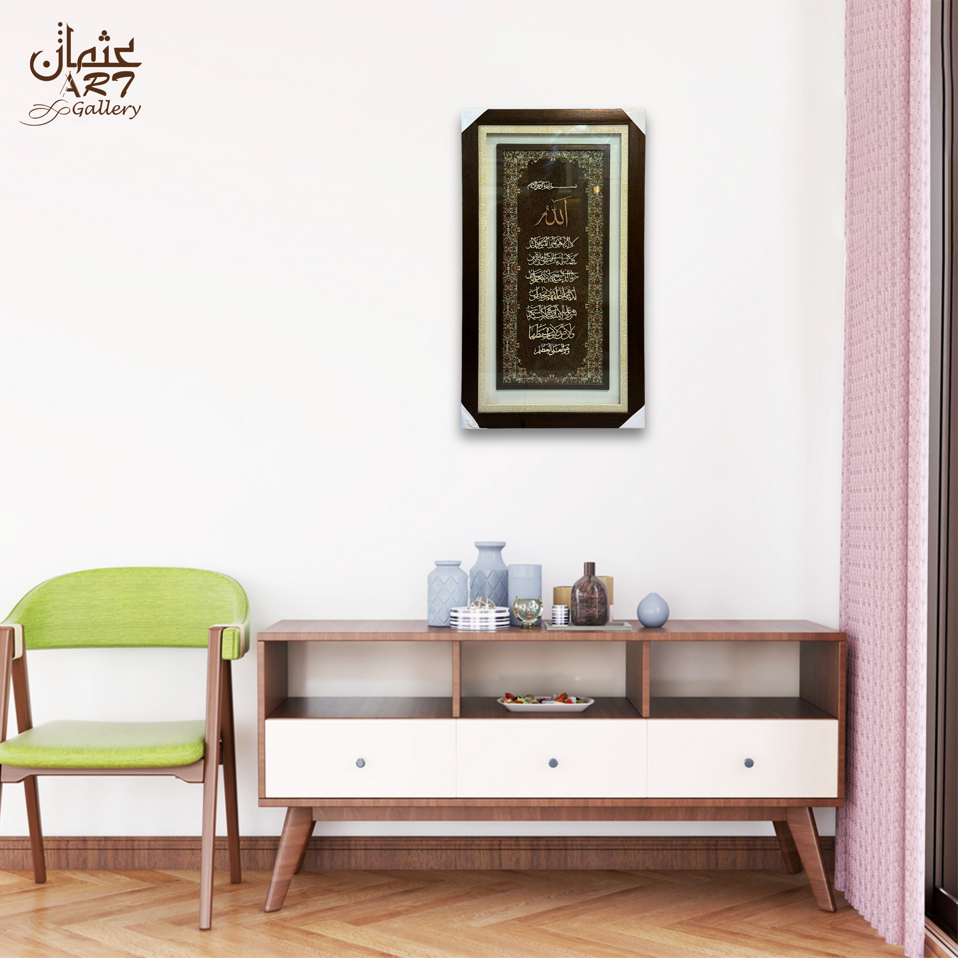 A refined Ayat-ul-Kursi composition crafted in wood cutting and presented with a richly patterned border. The calligraphy sits in a deep, traditional palette that highlights the script with clarity and reverence. Elegant framing gives the piece a distinguished presence suitable for formal living spaces or entryways. A timeless spiritual accent for any interior.