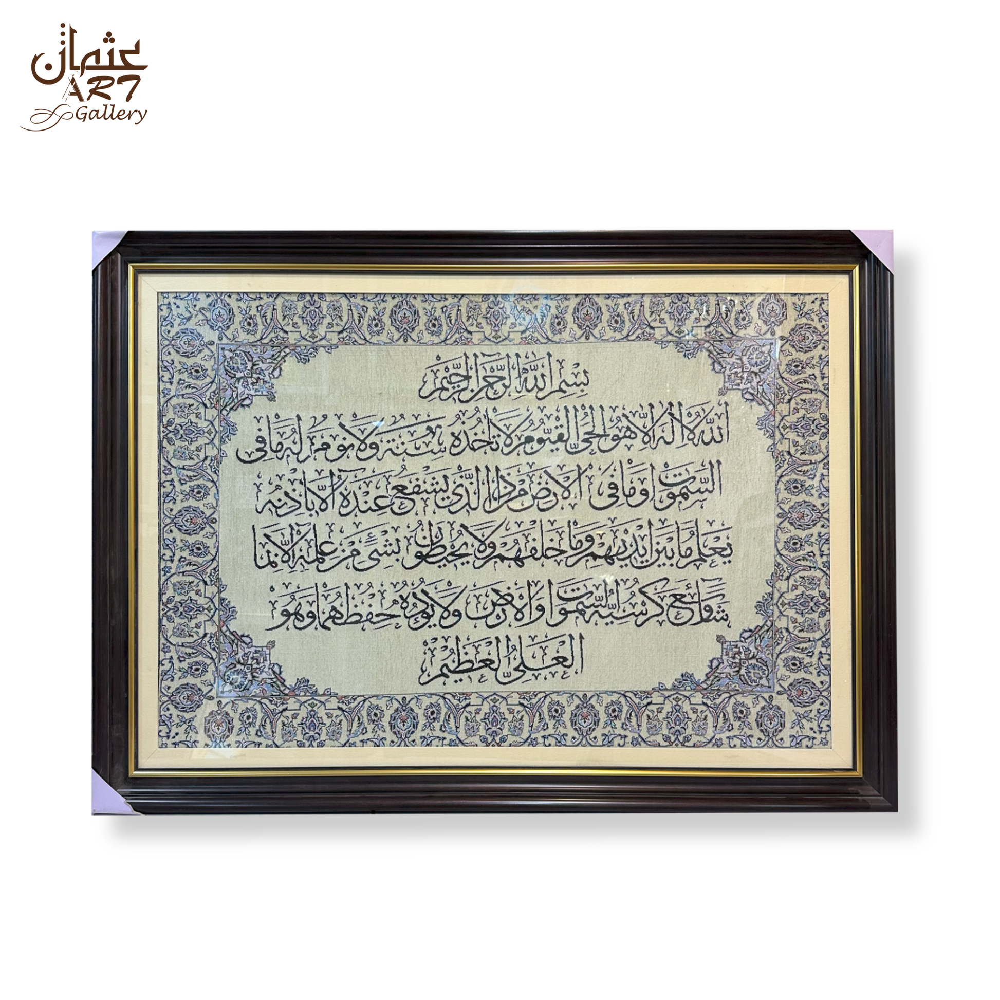 Iranian carpet artwork featuring Ayat-ul-Kursi calligraphy with intricate borders. Italian fiber framing adds durability and elegance to this spiritual wall piece.