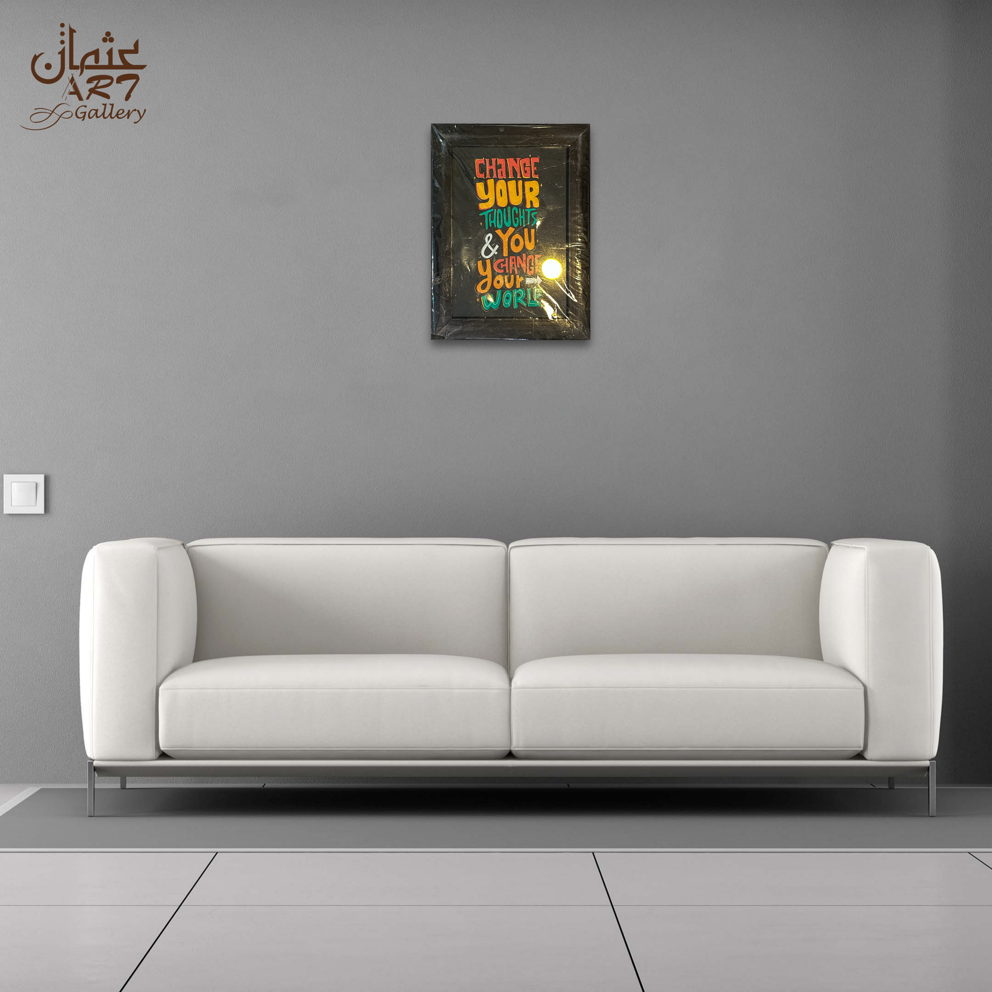 Colorful motivational wall art with the phrase "Change your thoughts & you change your world". Great for positivity and daily reminders.