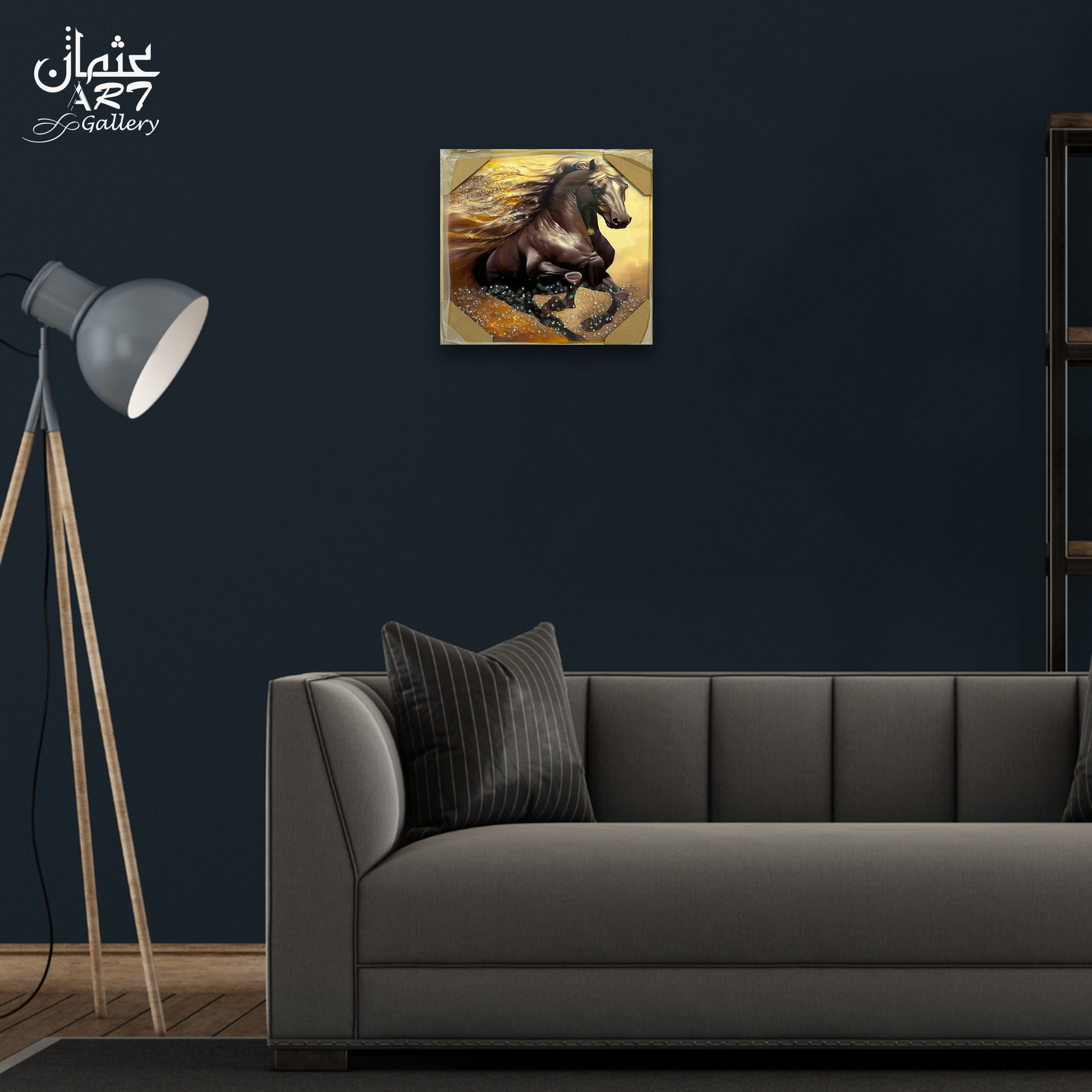 A dynamic resin artwork of a powerful horse mid-stride, mane sweeping across the frame with sparkling bead-like accents. Golden tones blend with rich browns and onyx shadows to create depth and motion. The glossy finish intensifies highlights and contours, turning the scene into a bold focal point. A striking pick for modern spaces that want energy and elegance.