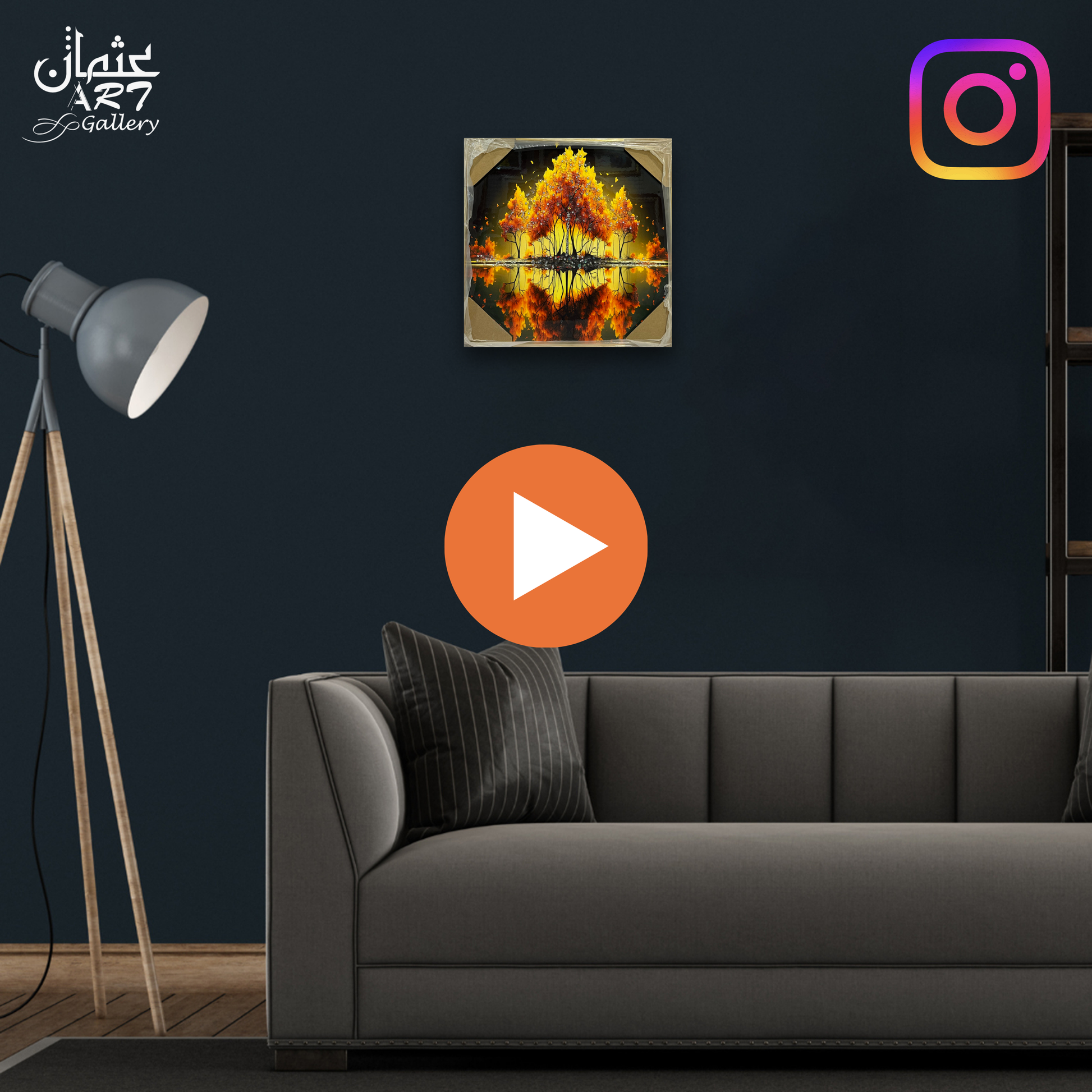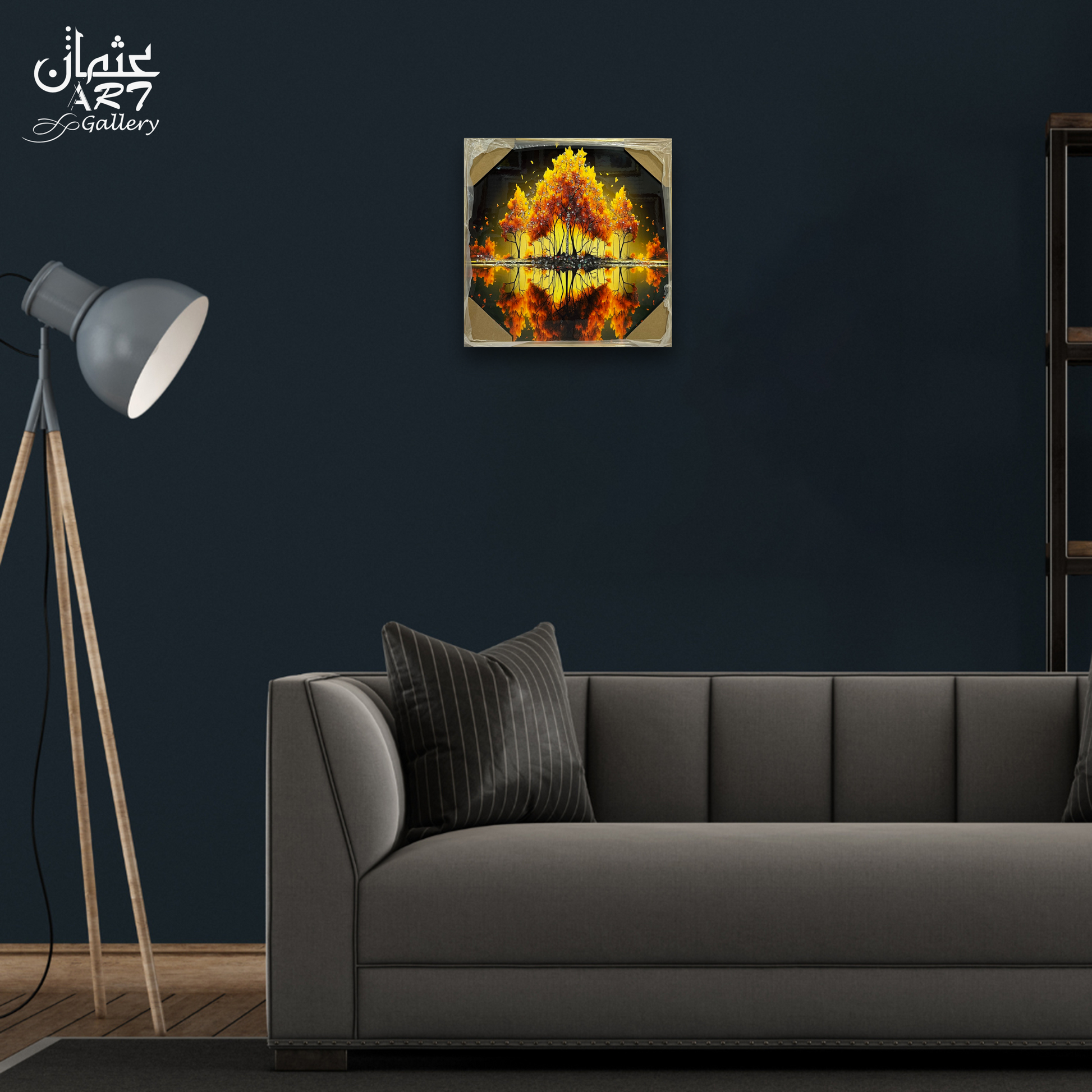 A striking resin painting of autumn trees glowing in warm golden tones, reflected perfectly in still waters. The fiery hues of red, orange, and yellow create a bold centerpiece full of energy and elegance. An ideal artwork for enhancing living or office spaces with natural charm.