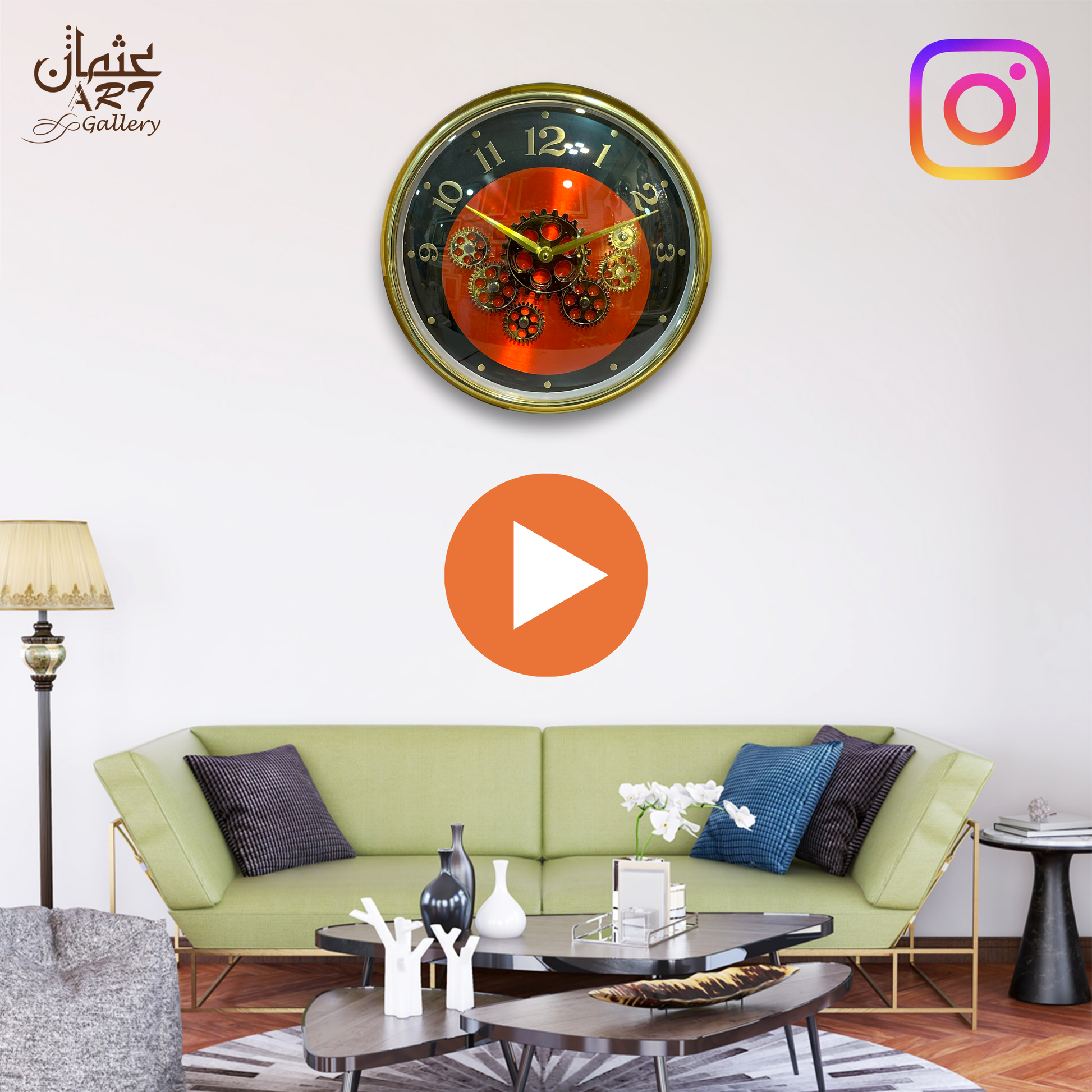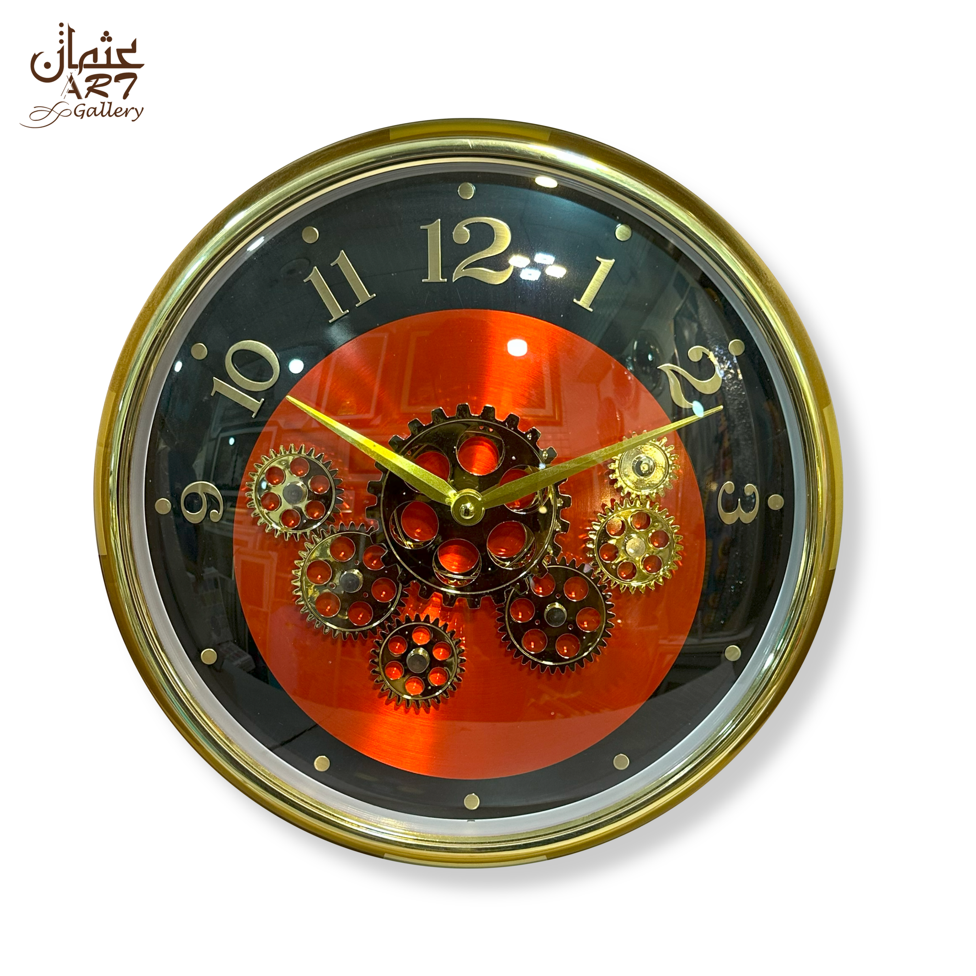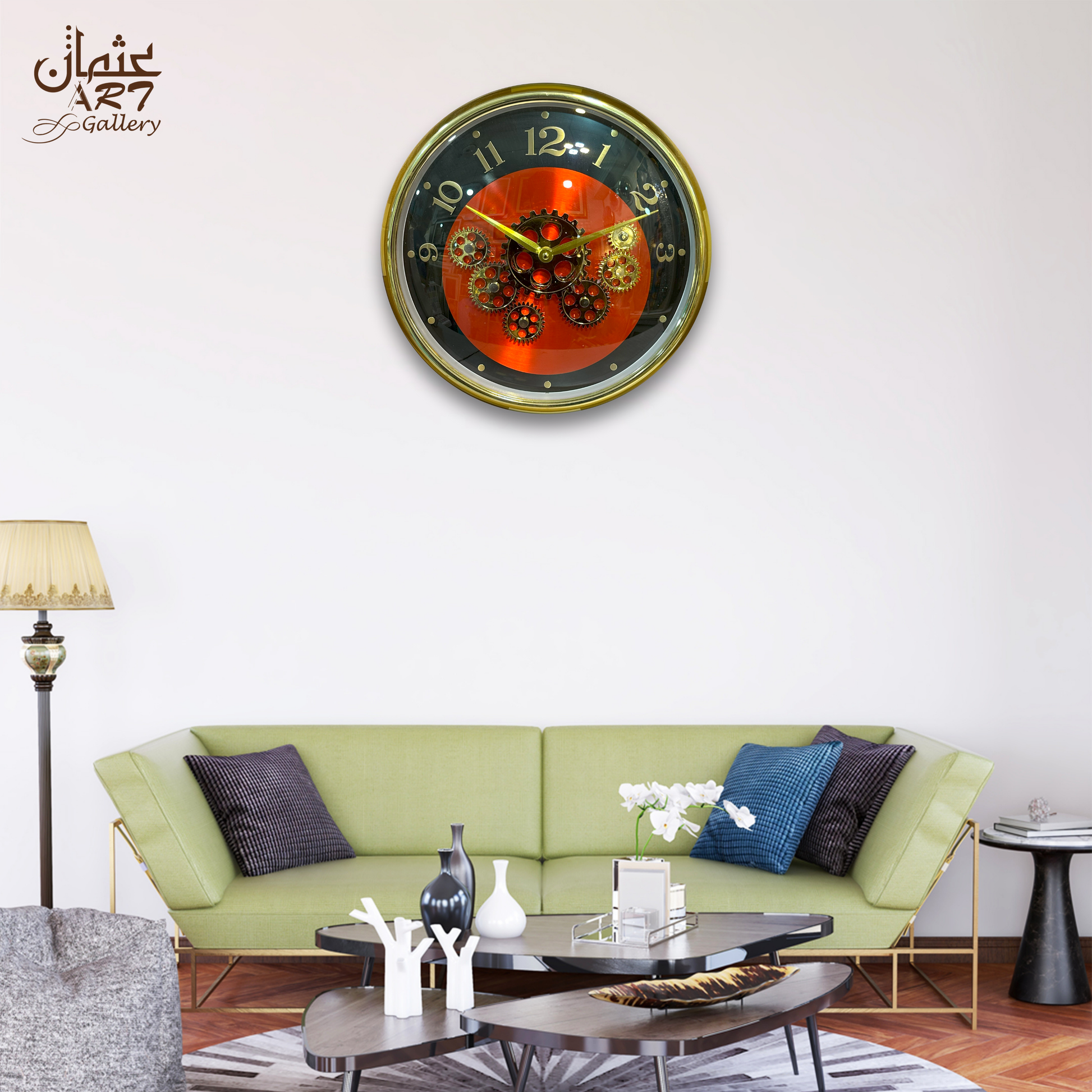 Elegant fancy clock with taper glass and a chrome-gold border. Featuring visible gears and a modern circular dial for a stylish decorative touch.