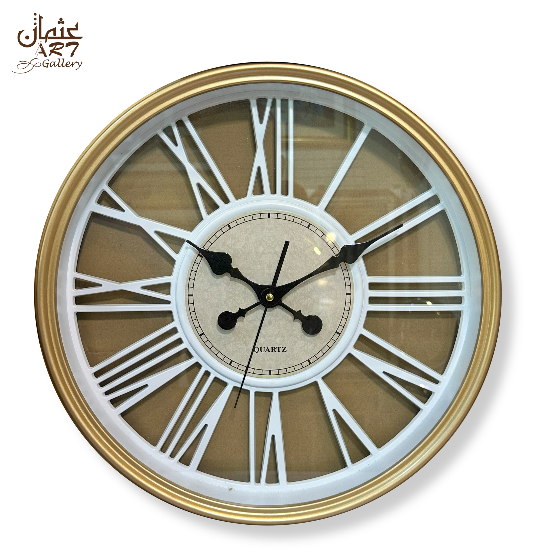 Decorative antique wall clock with a golden rim, Roman numeral design, and a vintage-inspired look for elegant spaces.