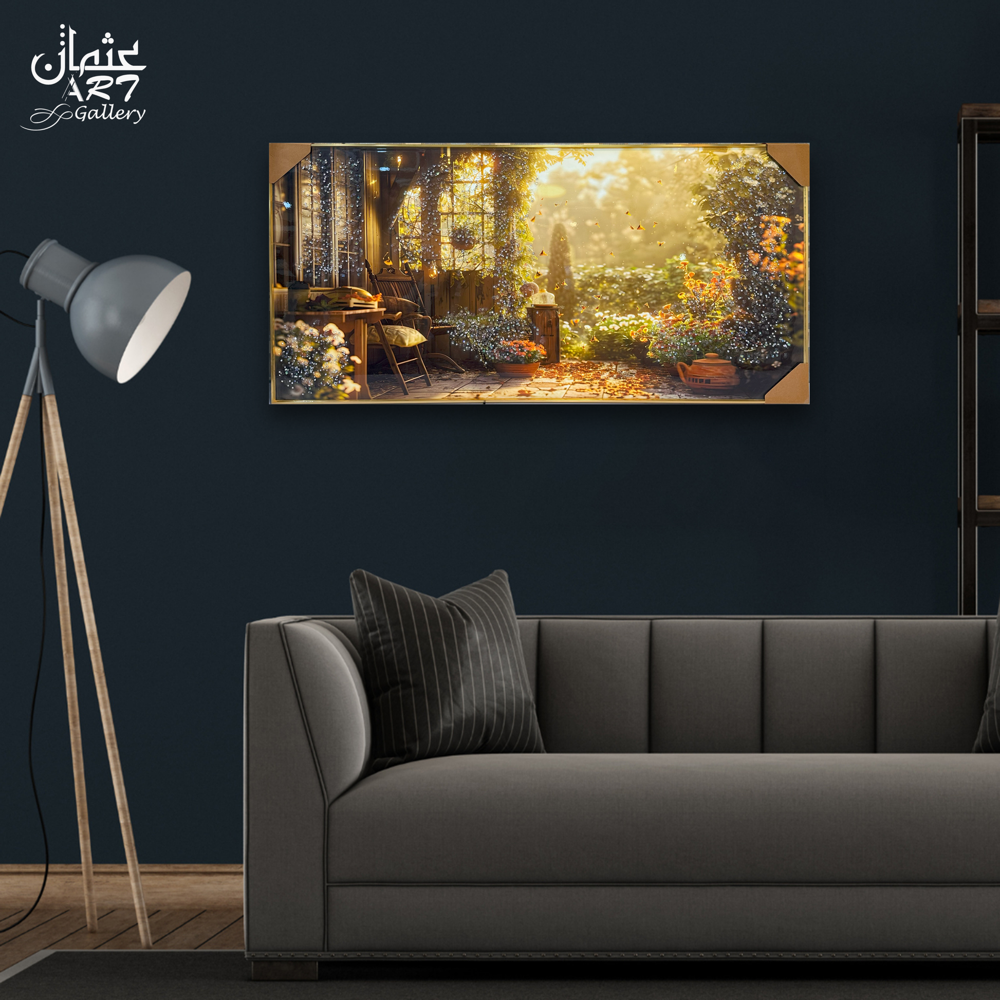 Epoxy resin artwork of a bright golden garden terrace scene with flowers and glowing light accents, framed in golden aluminum. A warm, nature-inspired decorative piece.