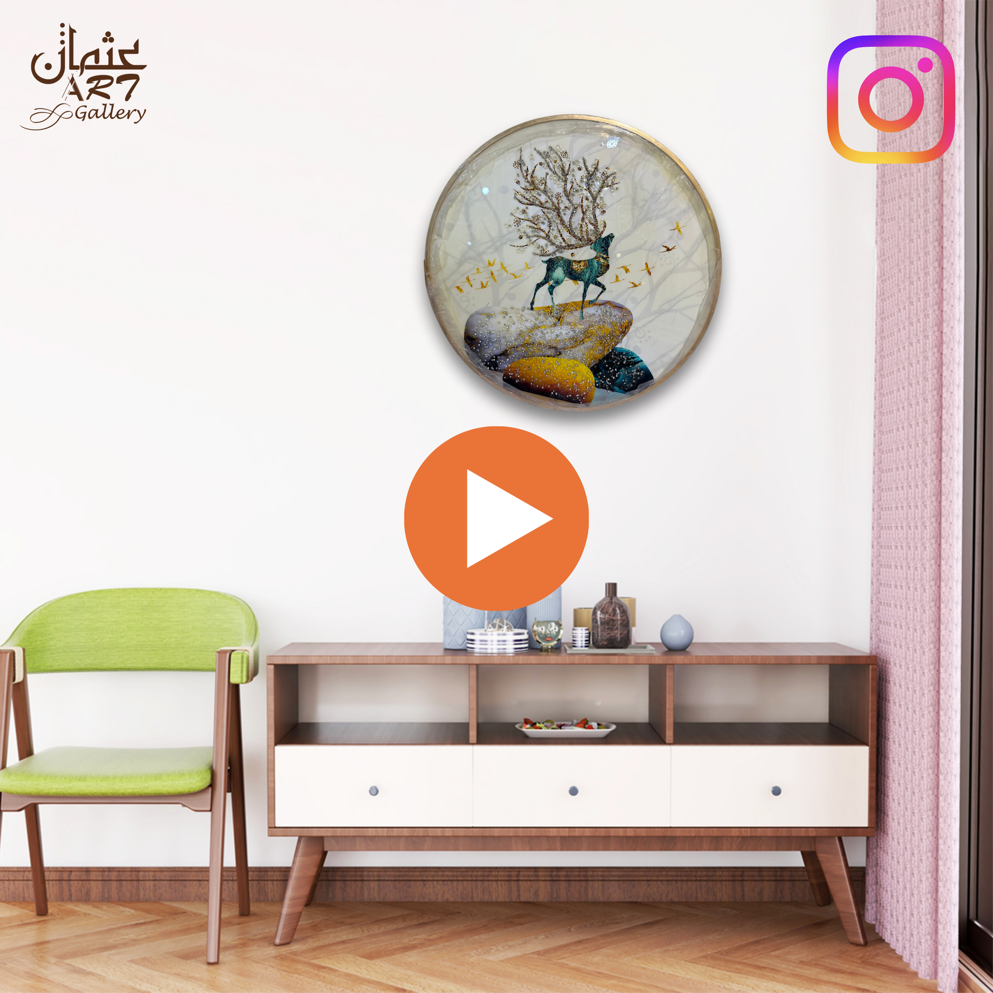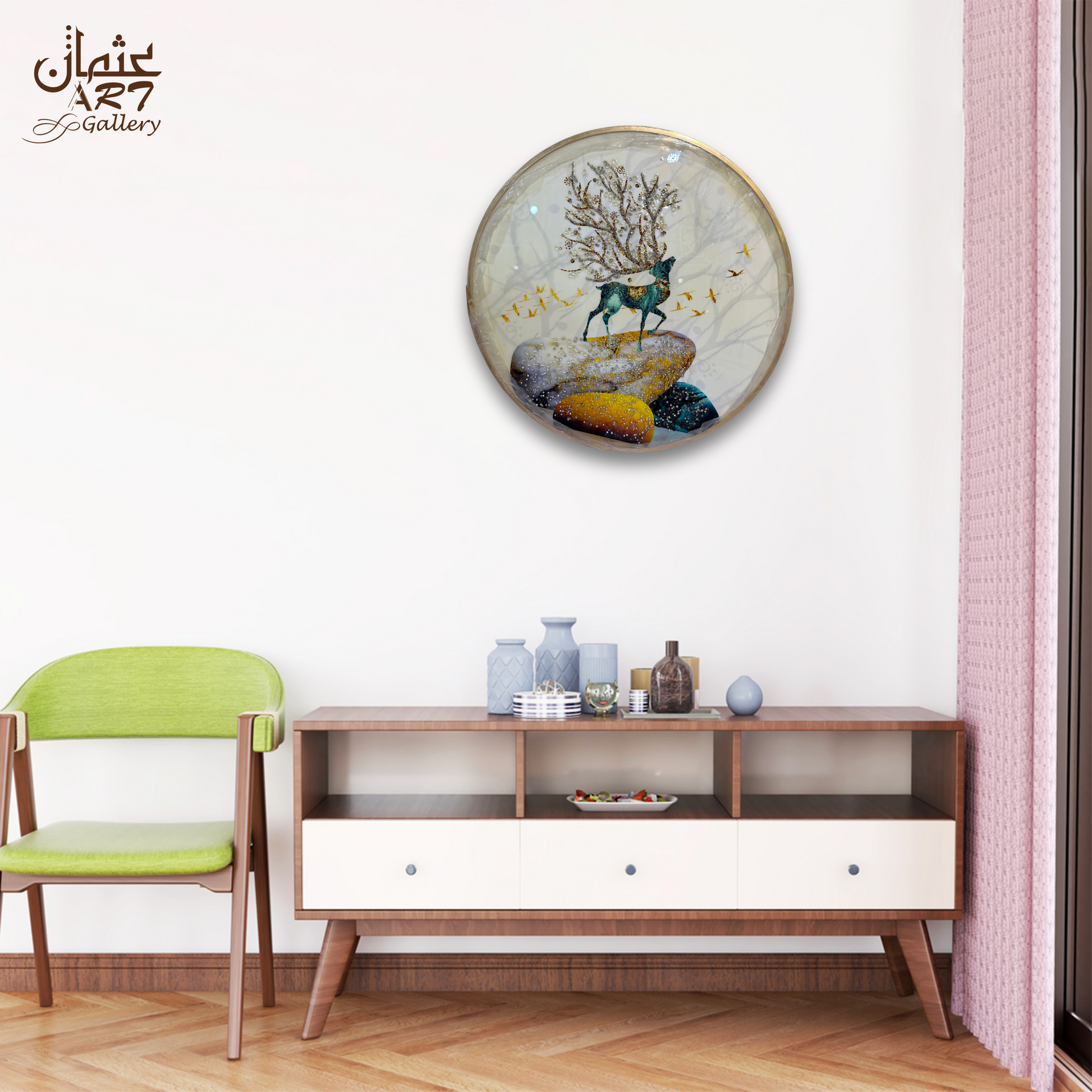 A mesmerizing round resin artwork featuring a majestic stag with intricate branching antlers, surrounded by golden birds in flight. The detailed textures of rocks and trees bring the scene to life, enhanced by pearl-like accents that shimmer under light. The glossy epoxy finish adds depth and brilliance, making it a standout centerpiece. Perfect for adding elegance and nature-inspired beauty to modern interiors.