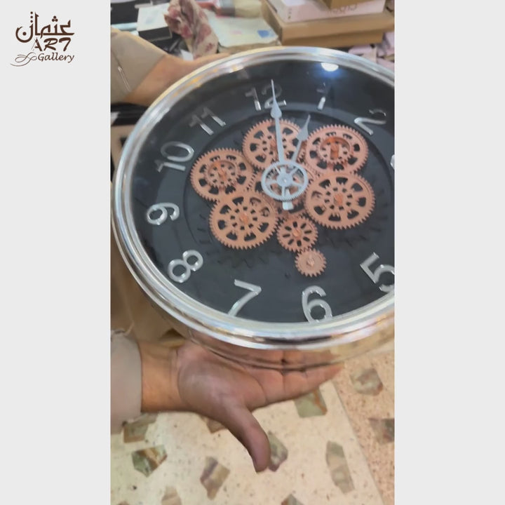 Striking gear clock with a chrome border, visible moving gears, and modern quartz precision for a bold industrial look.