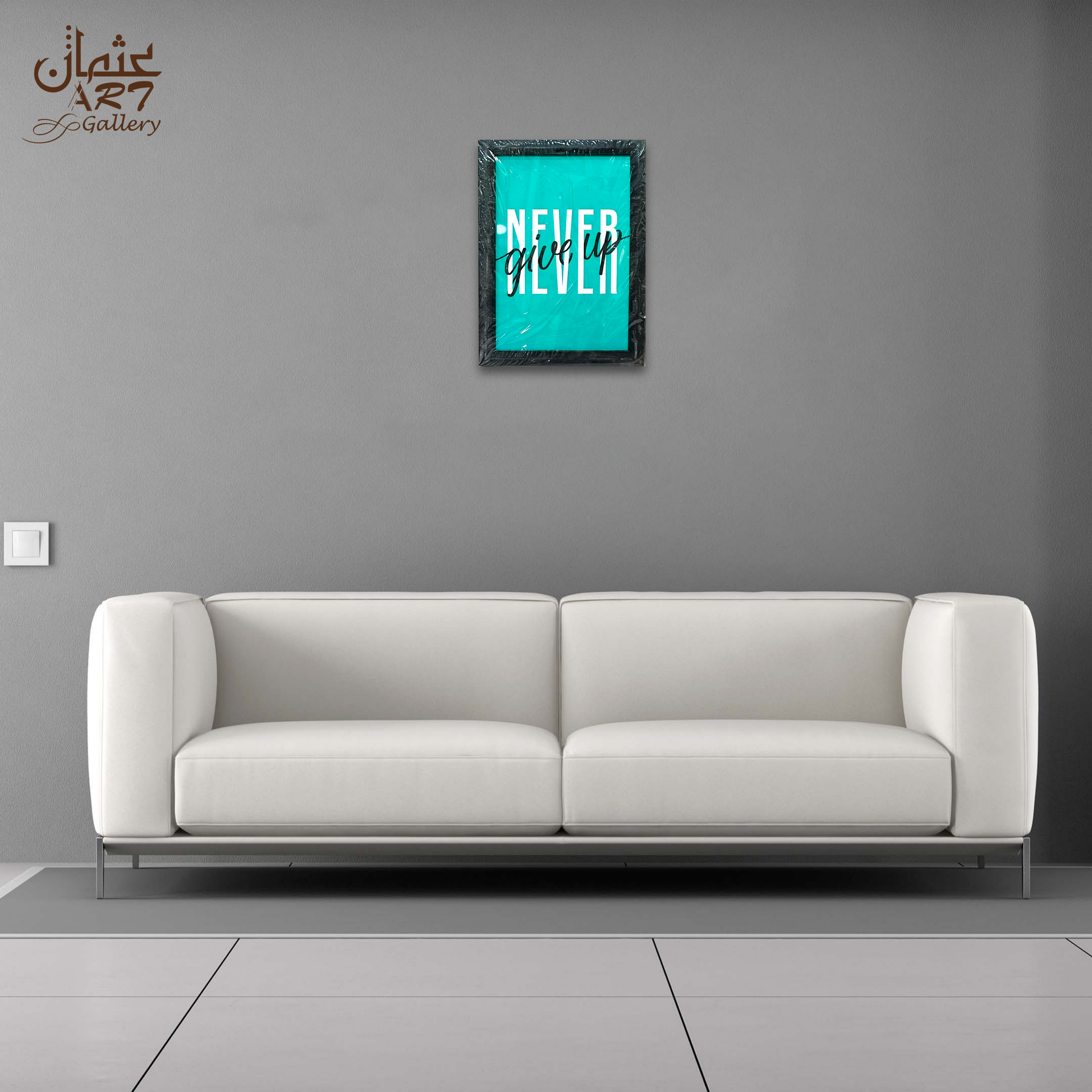 Bold motivational wall art with teal background and “Never Give Up” text in striking white and black font. Compact size ideal for desk, office, or small wall spaces.