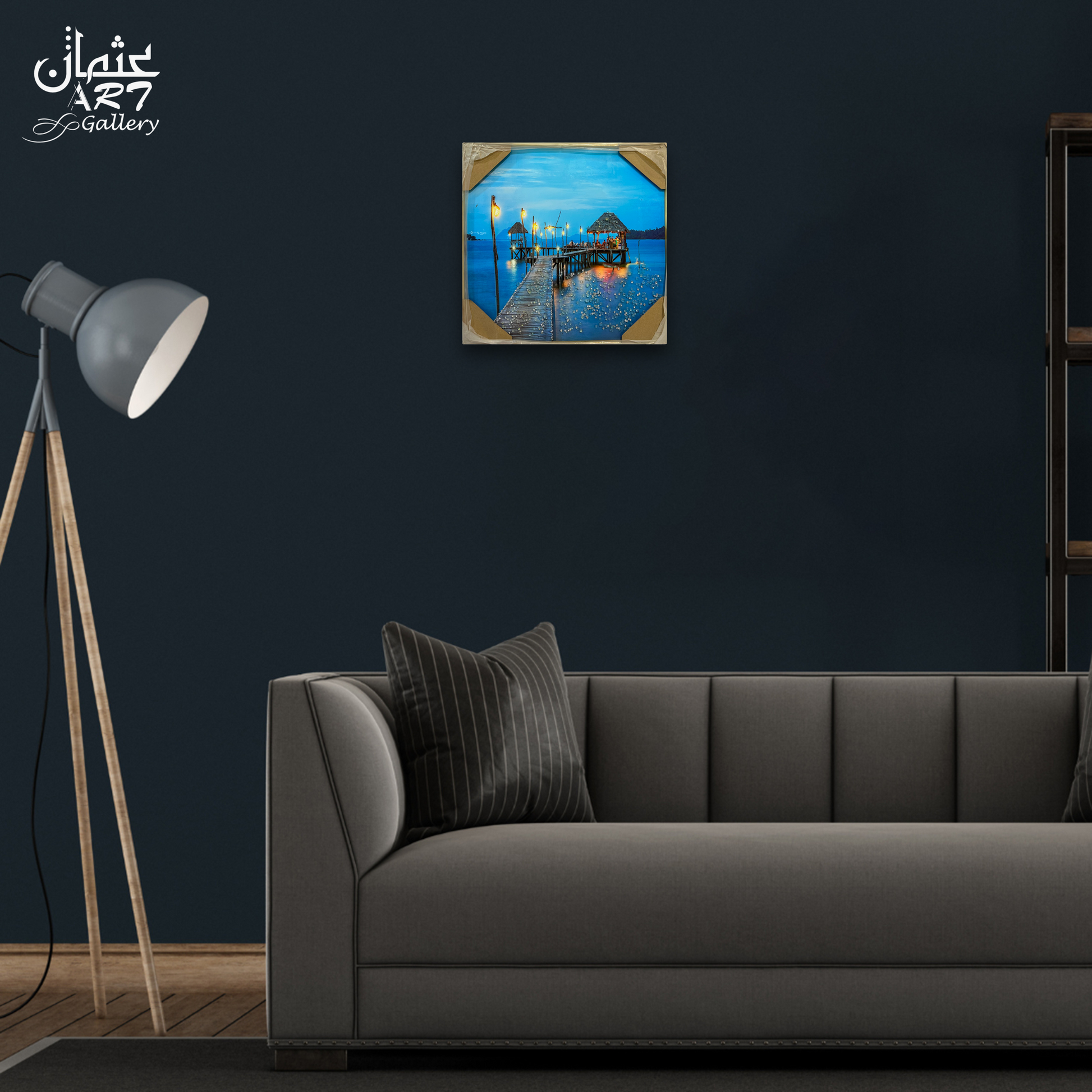 A captivating resin artwork depicting a serene pier leading out to wooden huts over calm blue waters. The evening lights reflect beautifully across the surface, creating a sense of peace and warmth. This coastal-inspired piece is perfect for adding a tranquil touch to modern interiors.
