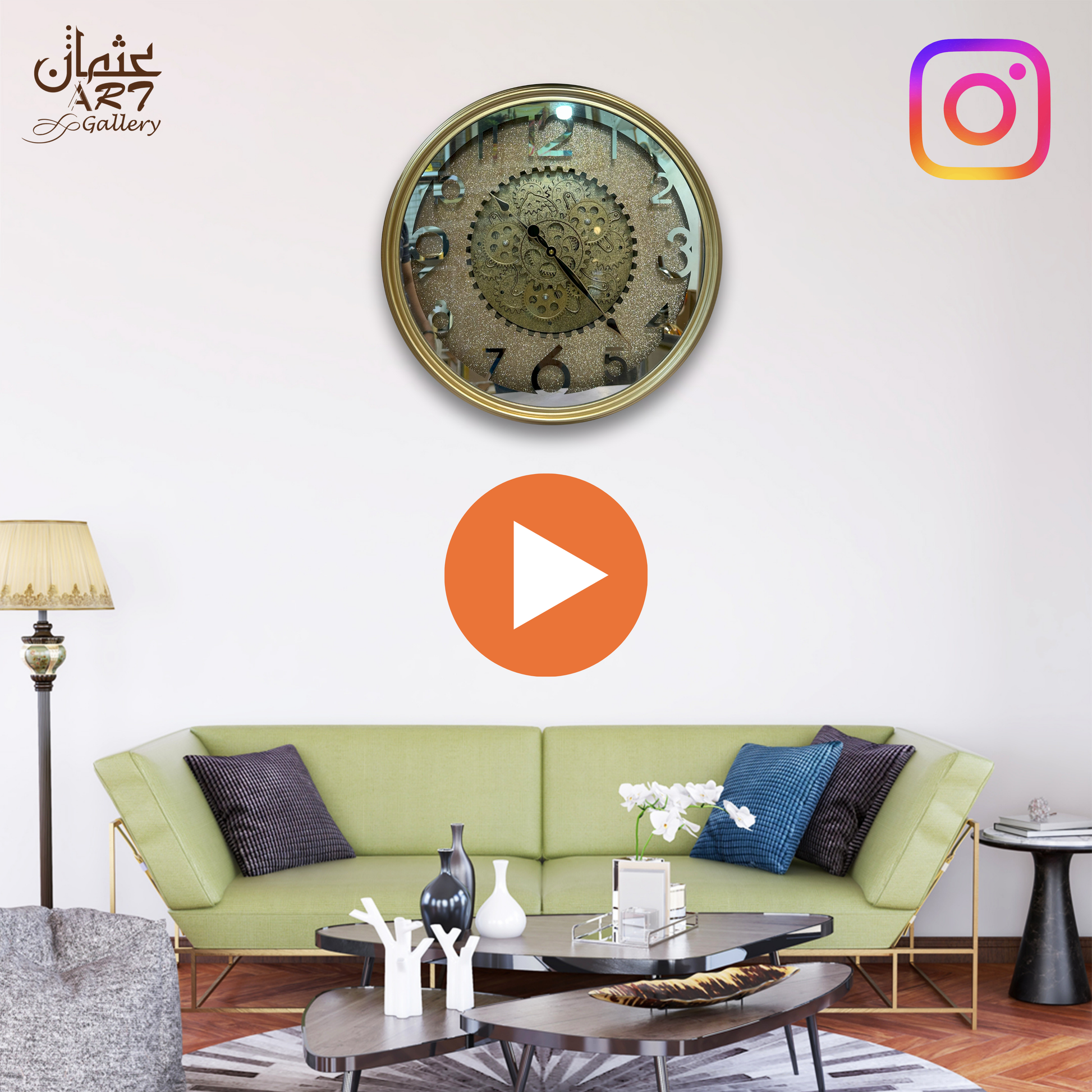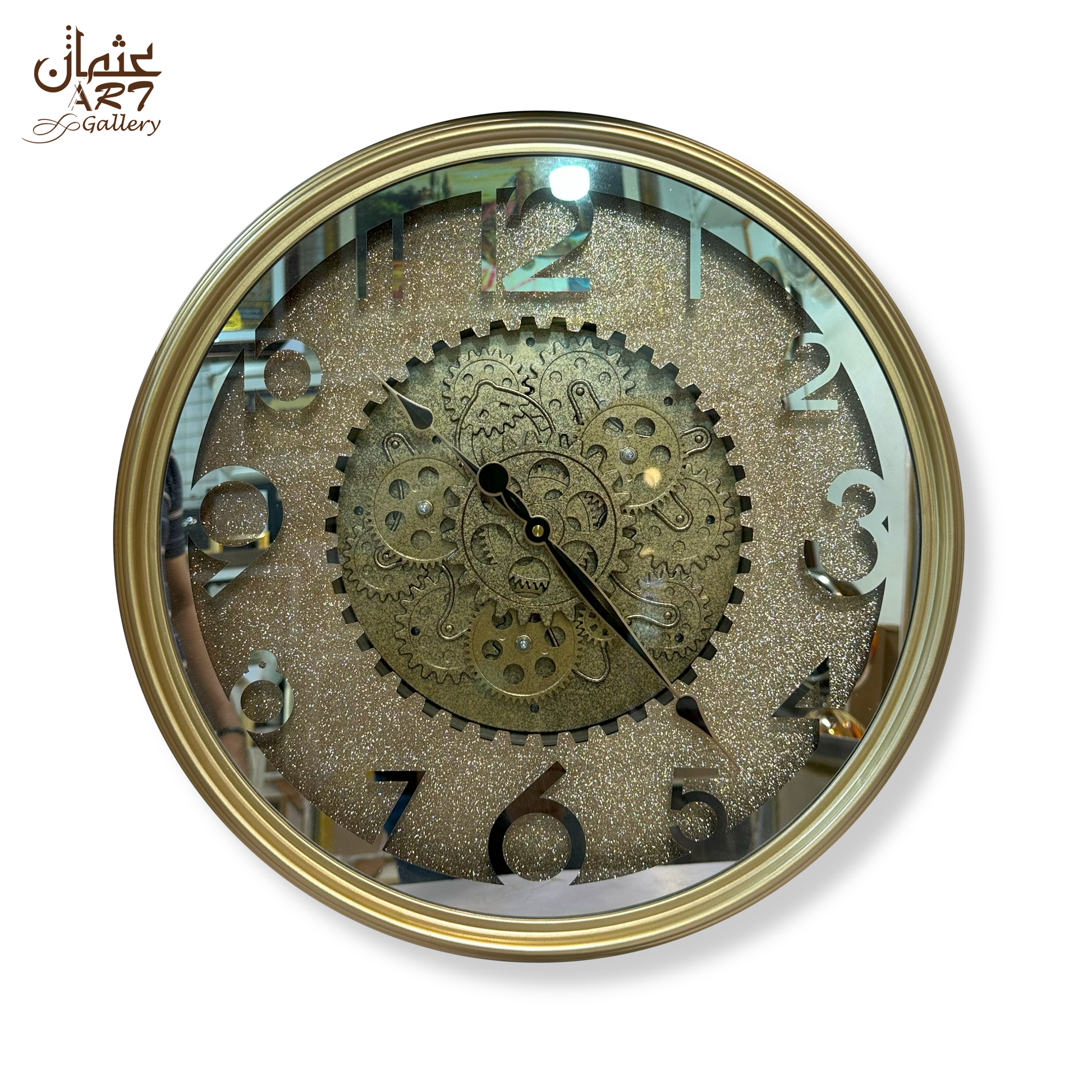 A modern resin gear clock featuring a shimmering dial design and intricate gear-inspired centerpiece. Adds both functionality and a decorative flair to any interior.