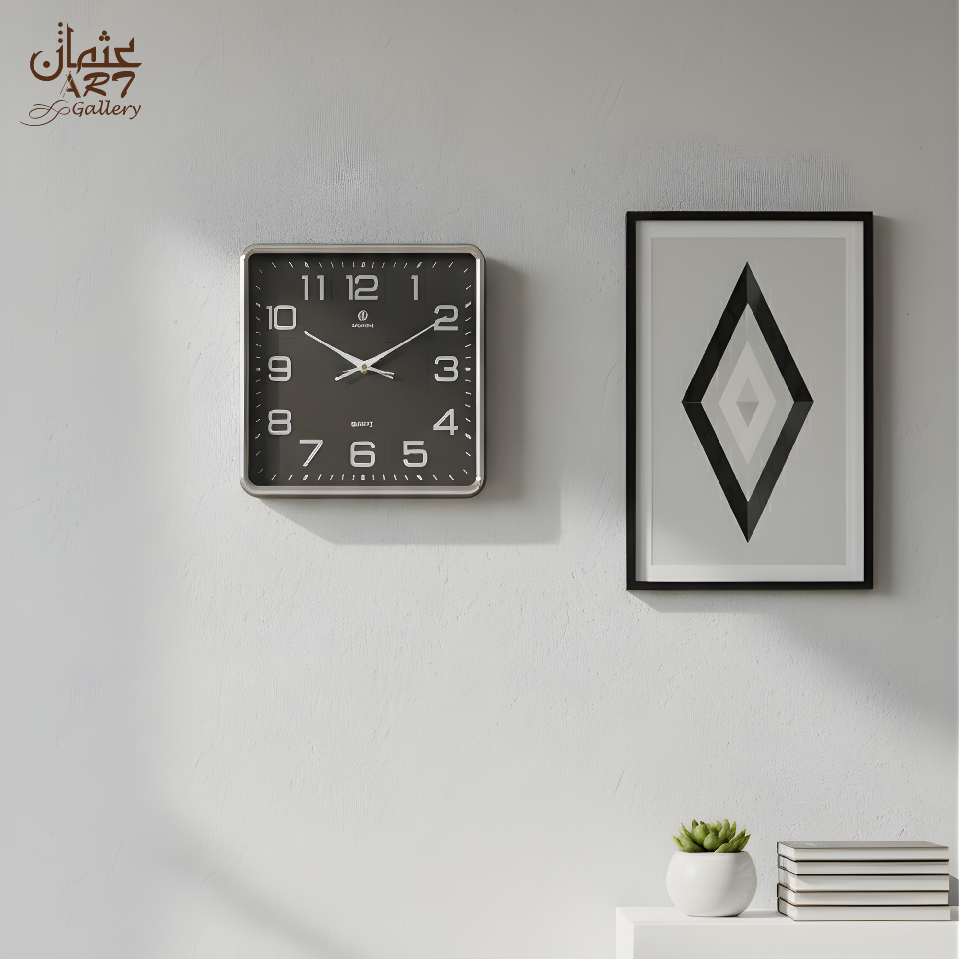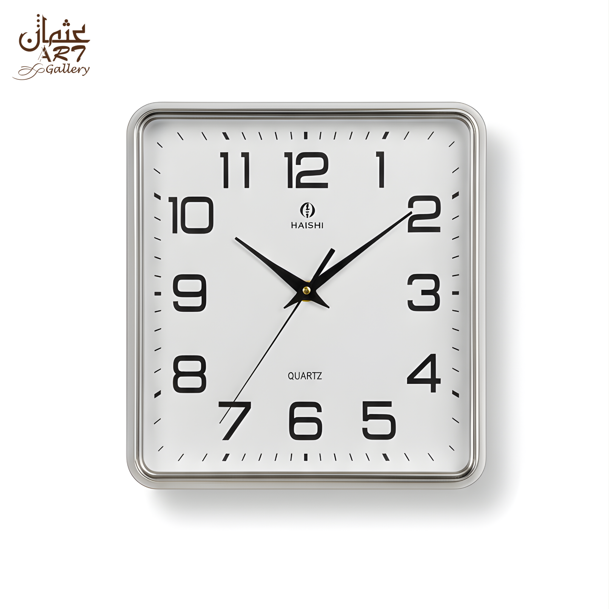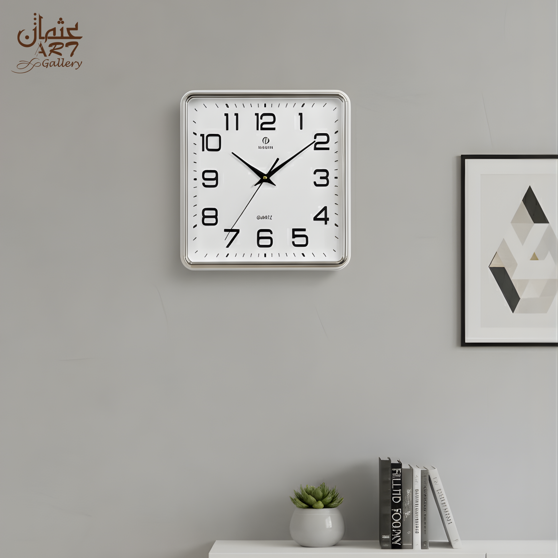 Sleek square wall clock with a silver-tone metallic frame and a clean white and black dial. Features clear, black Arabic numerals and imported quartz movement.