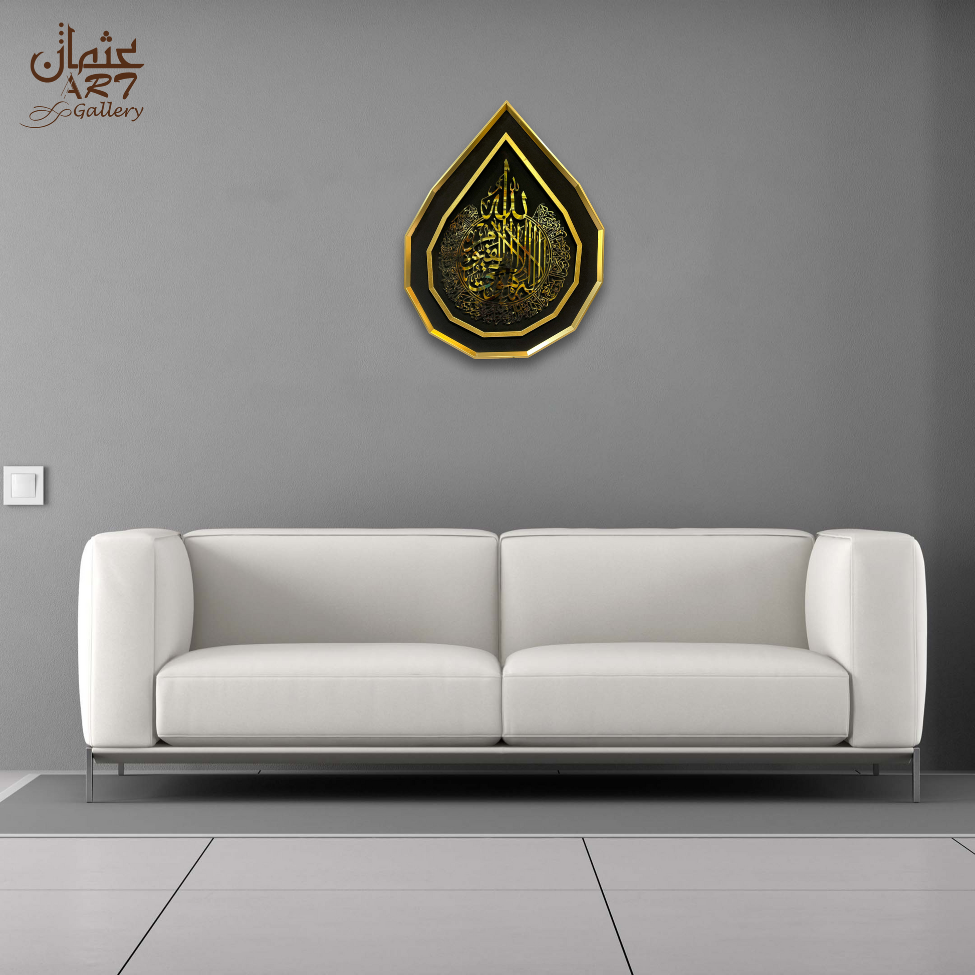 A premium Ayat-ul-Kursi wall piece crafted in stainless steel, set over a deep black base for high contrast and clarity. The side-parallel layout and angular bordering frame add a modern architectural feel, while the smooth, washable finish keeps maintenance easy. Layered detailing gives the calligraphy depth and presence, making it a refined focal point for living rooms, entrances, and prayer areas.