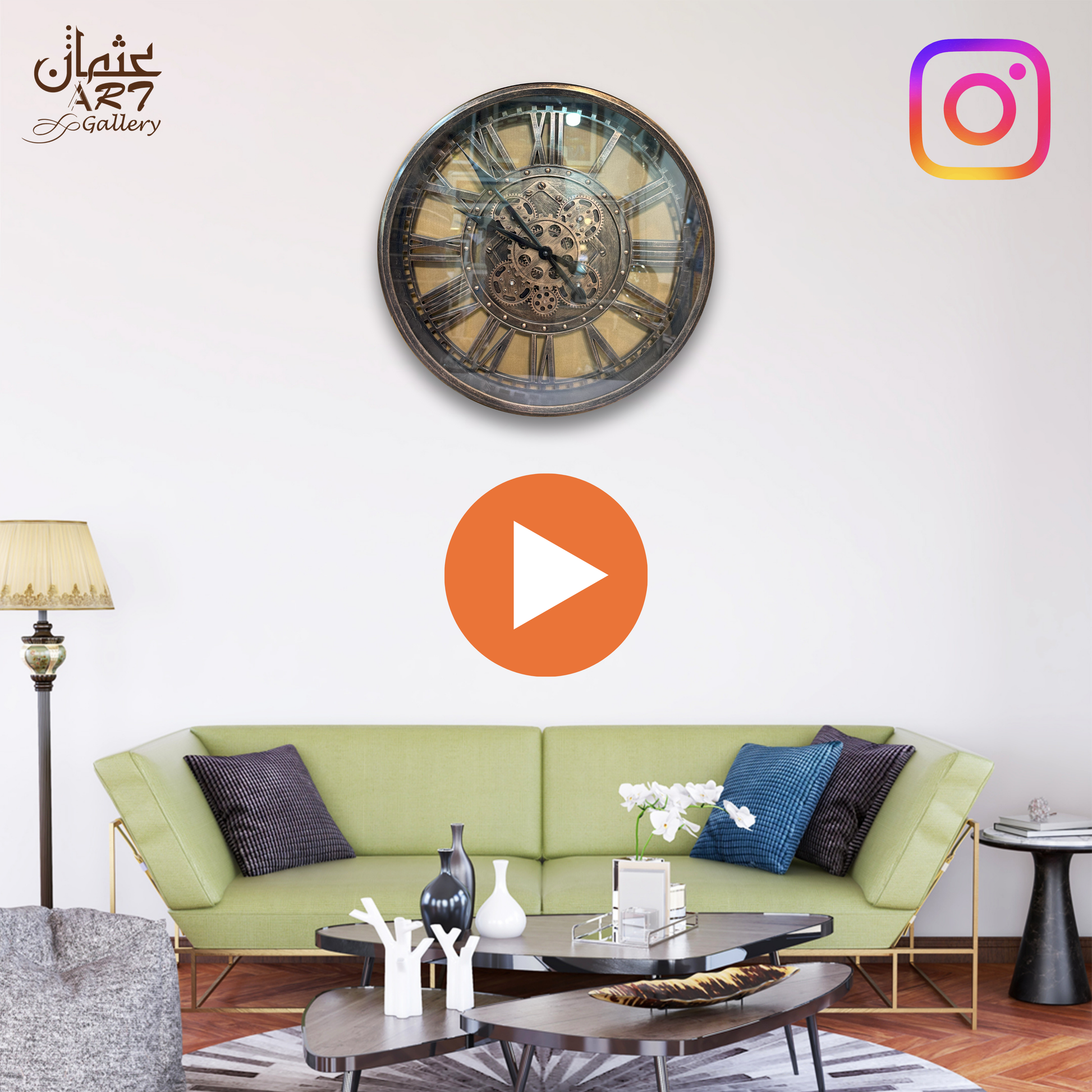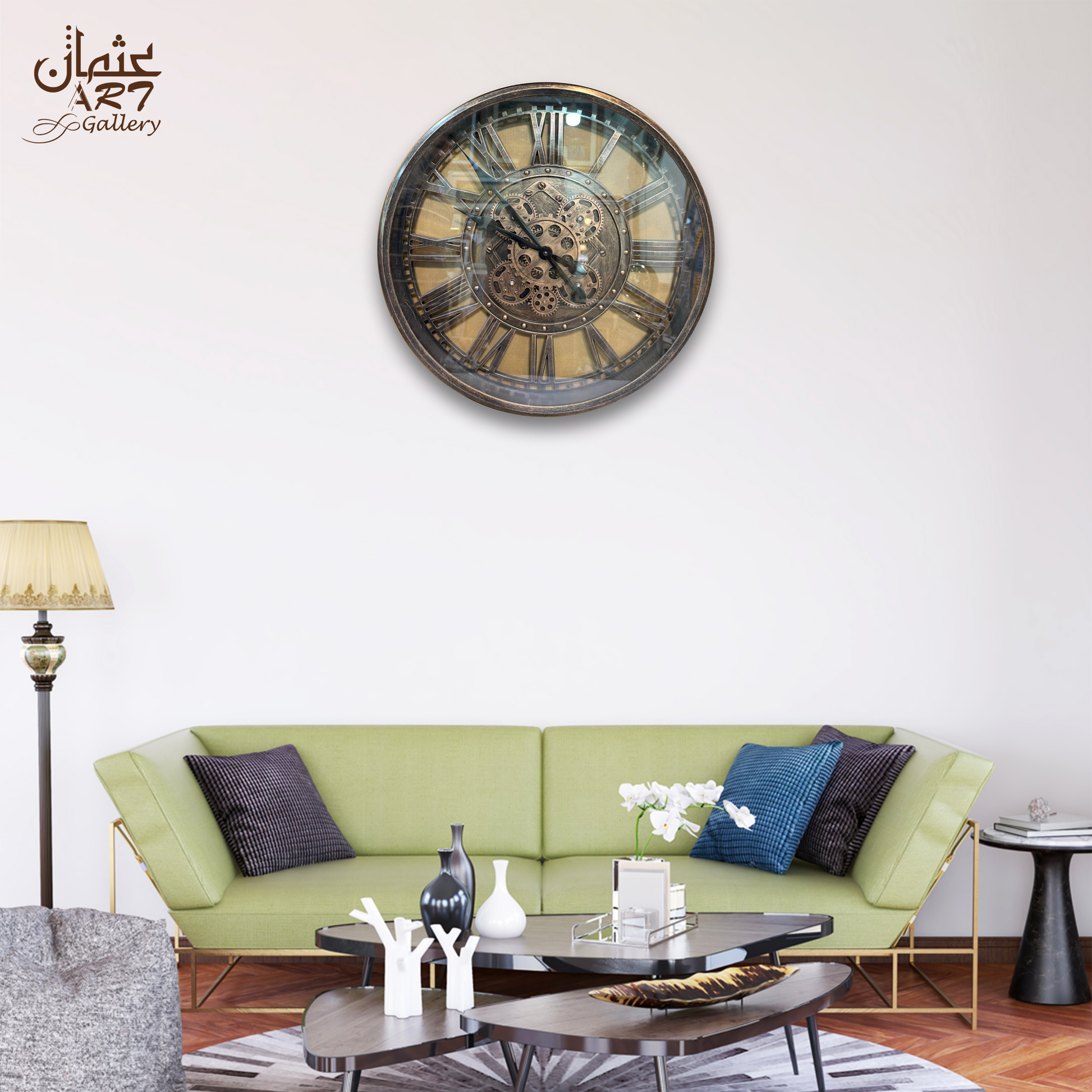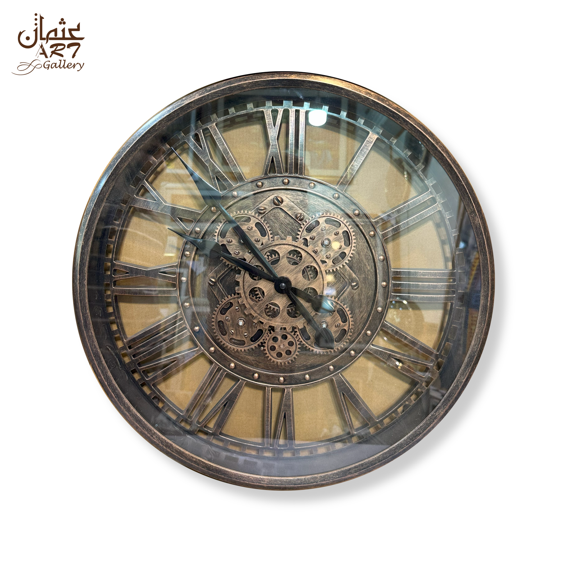 Large 22-inch steel gray antique clock with transparent background and full gear detailing. Premium décor piece with quartz accuracy.